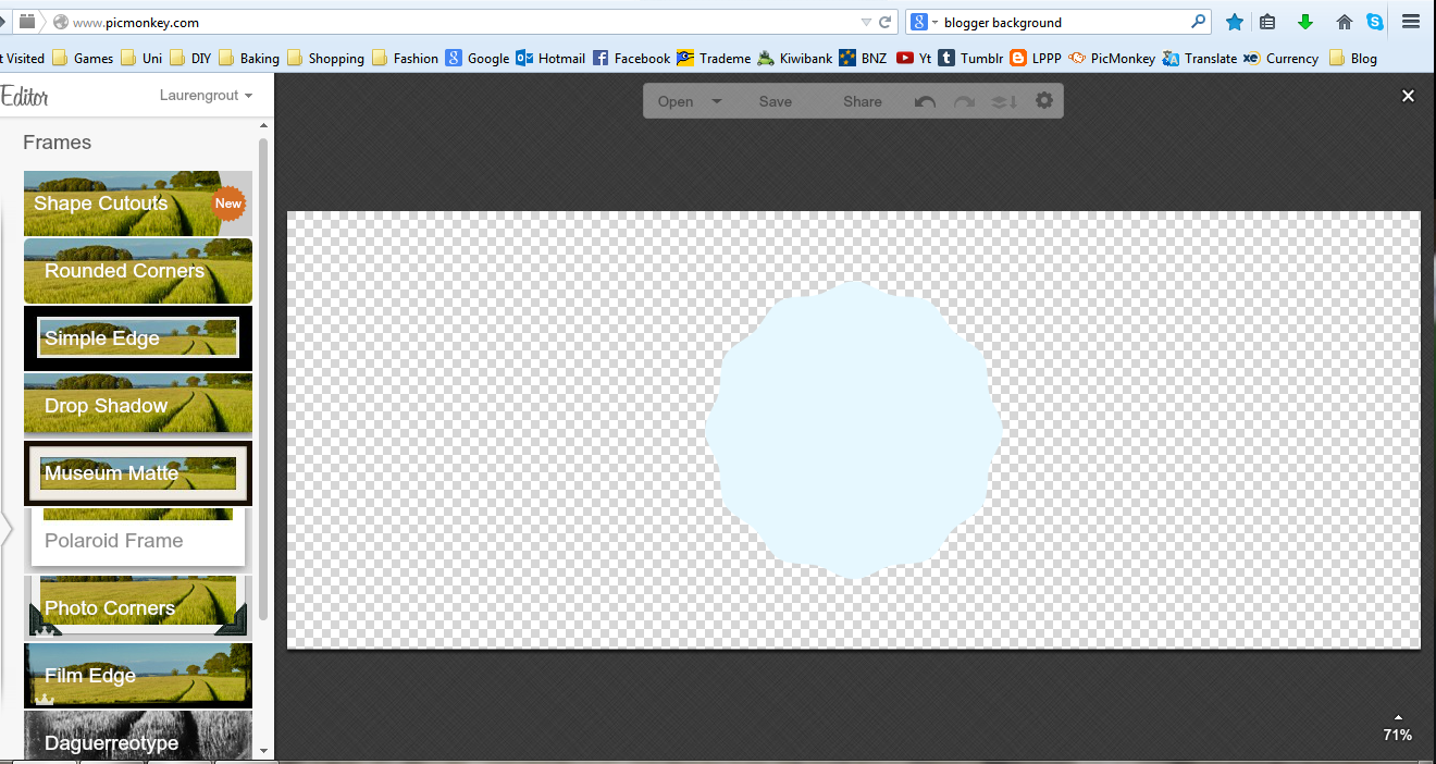 Create a coloured background in paint with the right dimensions for your blog, or find a patterned background (my main blog pictures are random floral photos) and open it up in Picmonkey. Click onto the Frames tab and chose a shape cut out. Click the transparent check box, chose a size (50%) and there you have your first cut out!